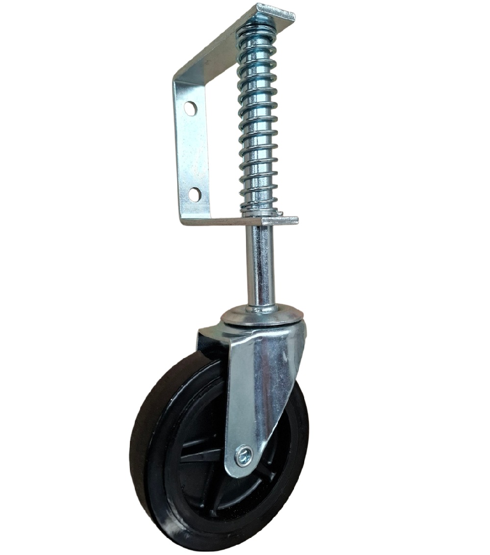 Support wheel for swinging gates with spring loaded support.